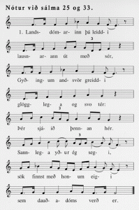 Við niðurskrift nótnanna var stuðst við sama söngdæmi og við 24. Passíusálm, söng Skarphéðins Gíslasonar (f. 1895) á Vagnstöðum í Suðursveit og systur hans Valgerðar Gísladóttur (f. 1898). Upptökuna gerði Hallfreður Örn Eiríksson 1967. Tóntegund: Lókritísk.
