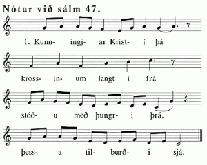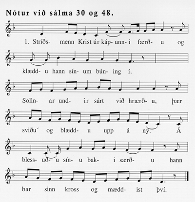 Söngdæmi það sem ég sýni hér er „lagfærð“ gerð af söng Guðmundar Ingimundarsonar sem hljóðritaður var á vaxhólk árið 1907. Ég sýni einungis kjarnann í söng Guðmundar, þ.e. lagið sjálft án persónulegs skrauts hans sem nær útilokað er að líkja eftir í söng. Laggerð Bjarna Þorsteinssonar í Íslenzkum þjóðlögum (s. 745), skráð eftir Þorleifi Þorleifssyni á Siglunesi, er ekki mjög lík laggerð Guðmundar, en Bjarni birtir aðra laggerð sem hann fékk hjá Finni Jónssyni á Kjörseyri, og líkist hún mjög laggerð Guðmundar. Engin þessara laggerða líkist upprunalegum lagboða Hallgríms.